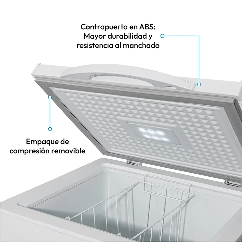 |  | Seguridad confiable para tu tranquilidad  Este congelador está diseñado pensando en tu seguridad y la protección de tus alimentos. Su puerta con manija externa plástica y chapa de seguridad garantizan un cierre firme y confiable, manteniendo el contenido resguardado frente a accesos no deseados. Ideal para hogares y negocios que valoran el control y la tranquilidad. |