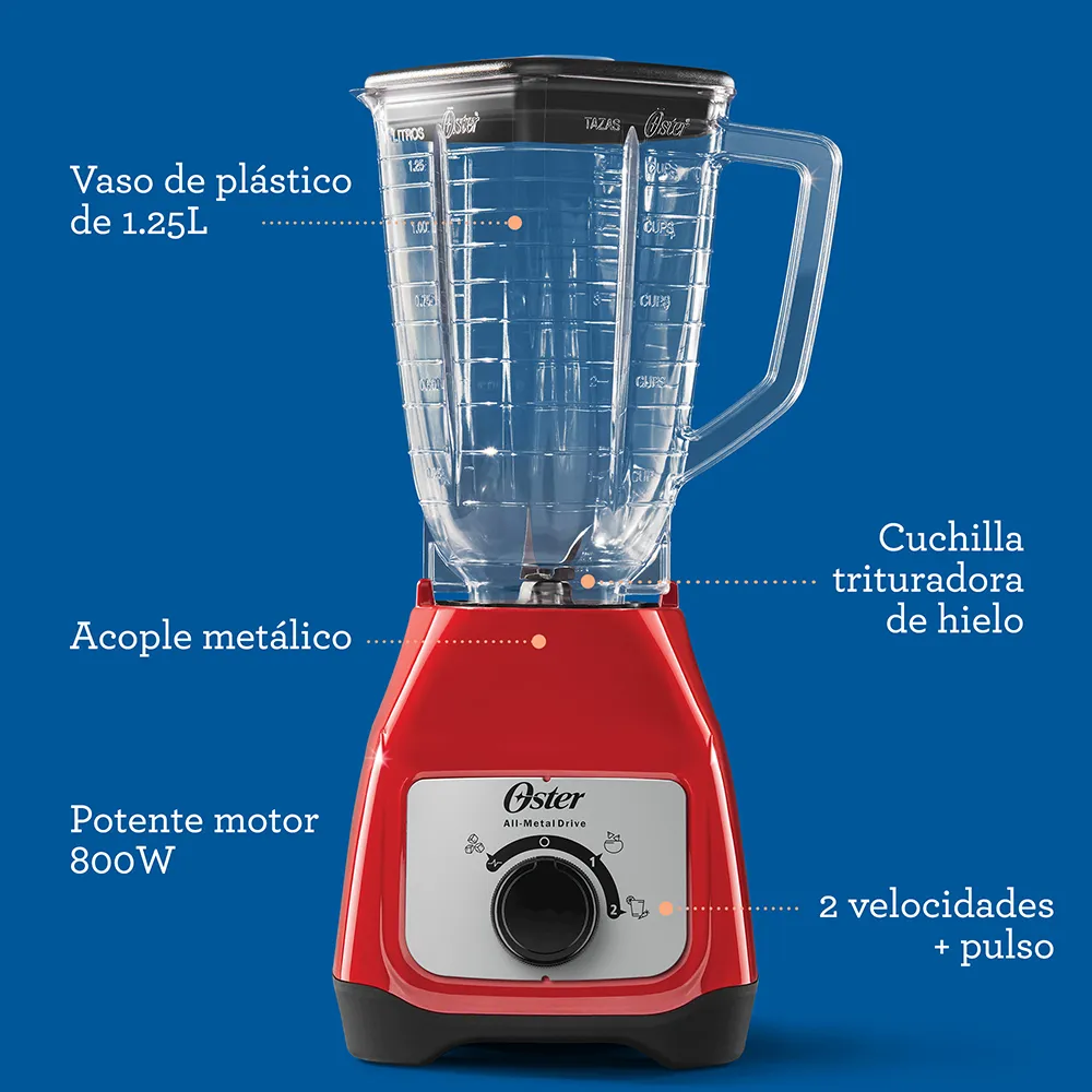 La licuadora Oster® combina practicidad y rendimiento para tu cocina. Con 2 velocidades y función de pulso, podrás preparar fácilmente jugos, batidos, salsas y más. Su motor 4 veces más duradero asegura potencia y resistencia para acompañarte en todas tus recetas.