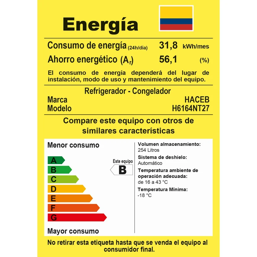 La Nevera HACEB No Frost de 254 litros combina diseño moderno con manija integrada y acabados metalizados, ofreciendo una solución eficiente para conservar tus alimentos por más tiempo. Equipada con el exclusivo sistema Himalaya de cinco componentes, garantiza frío sectorizado según el tipo de alimento, temperatura estable en cada zona, corrientes de aire que recorren cada rincón, bandeja con control de humedad para frutas y verduras, y un compartimiento extra-frío ideal para descongelar con mínima variación térmica. Es la opción perfecta para quienes buscan funcionalidad, estilo y frescura en su cocina. ¡Adquiérela hoy y transforma tu experiencia en refrigeración!